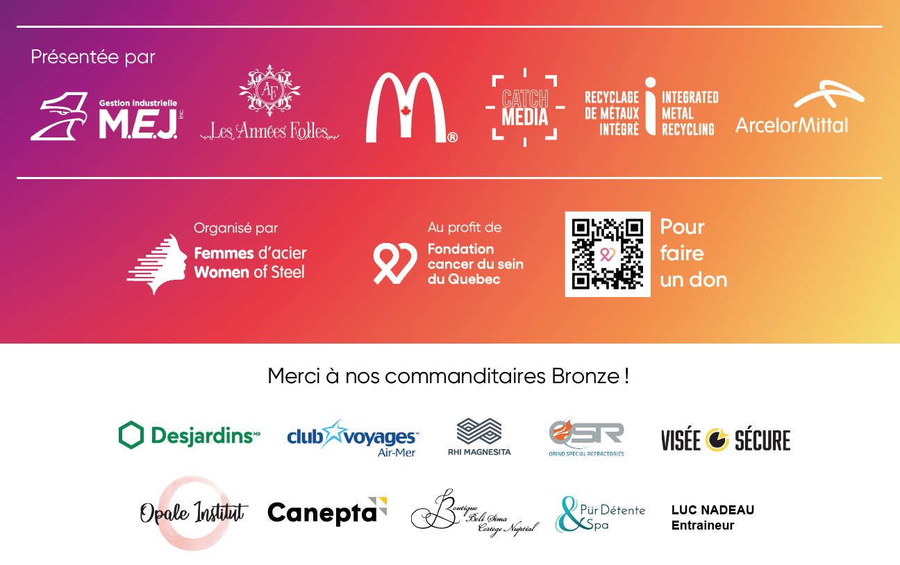 Merci à nos commanditaires Bronze : Desjardins, Club Voyage Air-Mer, RHI Magnesita, Orind Special Refractories LTD, Visée Sécure, Canepta, Pür Détente et Spa, Opale Institut, Luc Nadeau, Entraineur et Robe cortège – Boutique Beli Sima Cortège Nuptial.