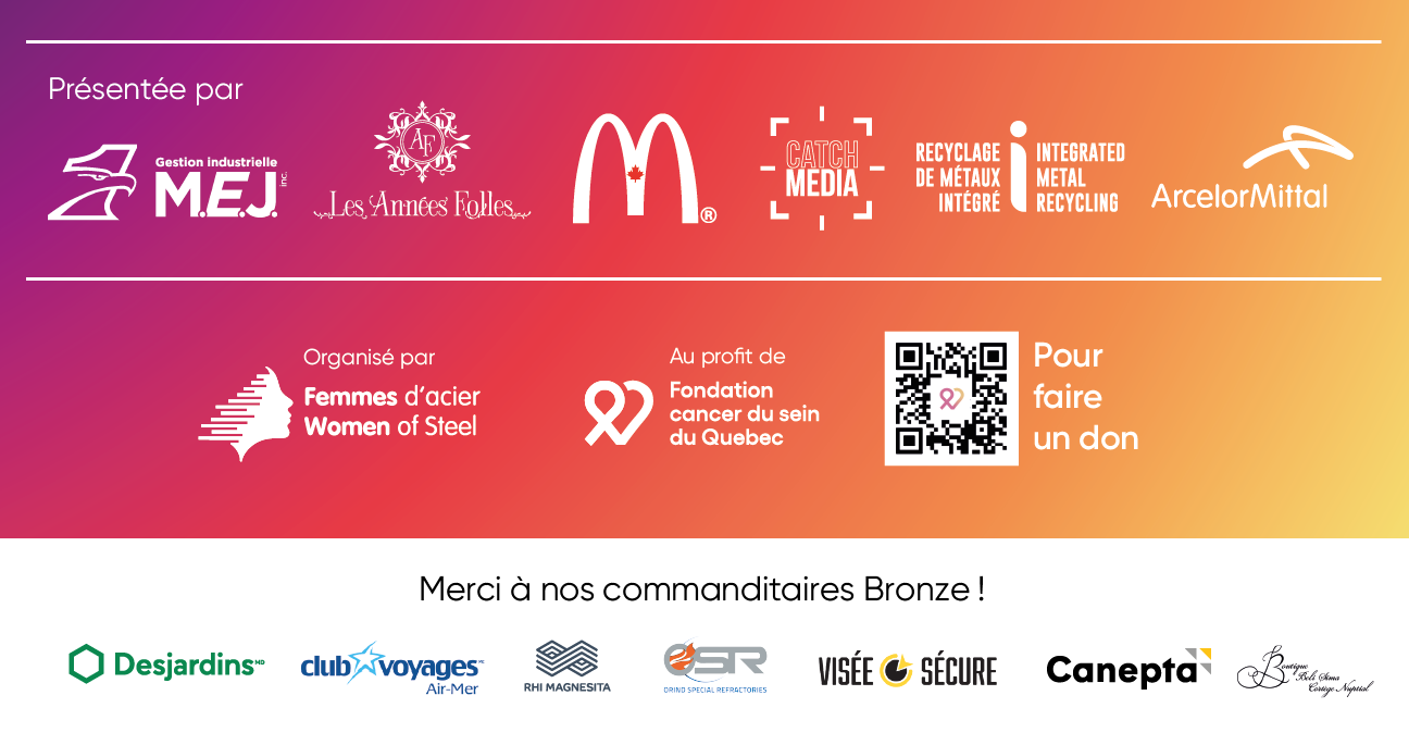 Merci à nos commanditaires Bronze : Desjardins, Club Voyage Air-Mer, RHI Magnesita, Orind Special Refractories LTD, Visée Sécure et Canepta.